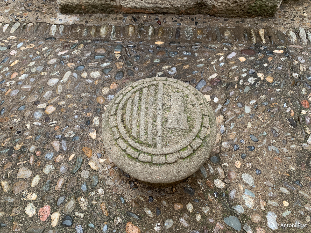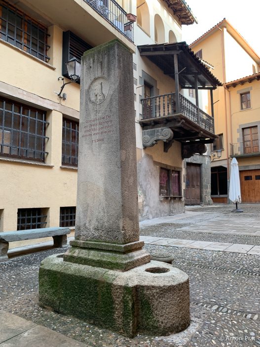 Al seu davant i clavat al terra hi han un piló mig rodó amb l’escut de Torelló.