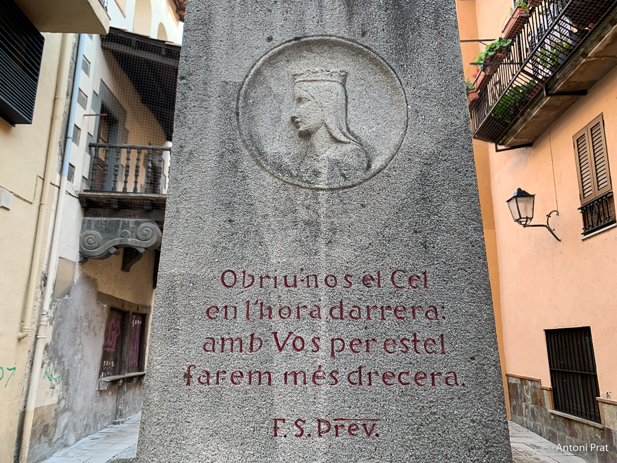 Es troba a la placeta de Mn. Fortià Solà. El seu estat de conservació és correcte -n’hi ha sort que tot ell és de pedra-, encara que nul sigui el seu manteniment, doncs s’ha anat perdent el color de les lletres gravades a la pedra. Ben poca sensibilitat per part de qui pertocaria fer-ho.