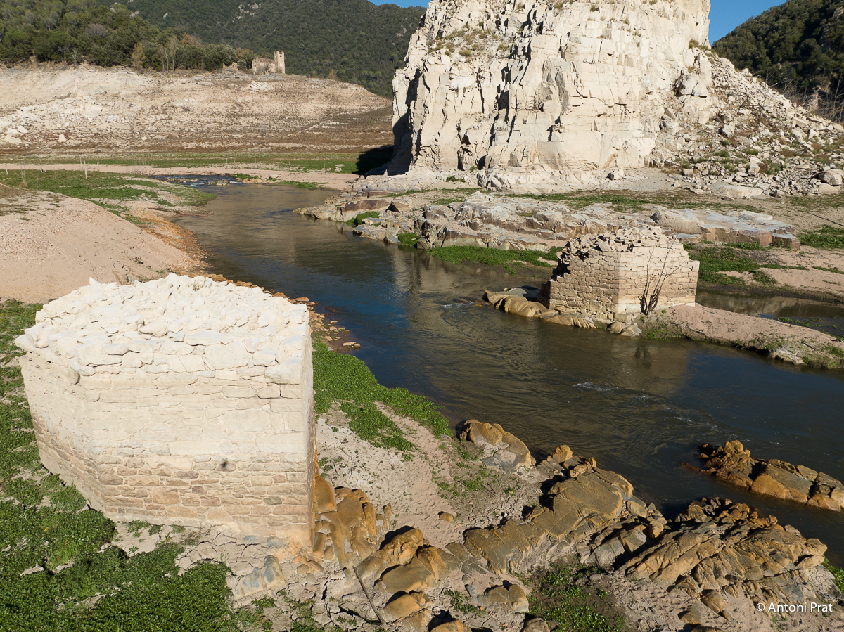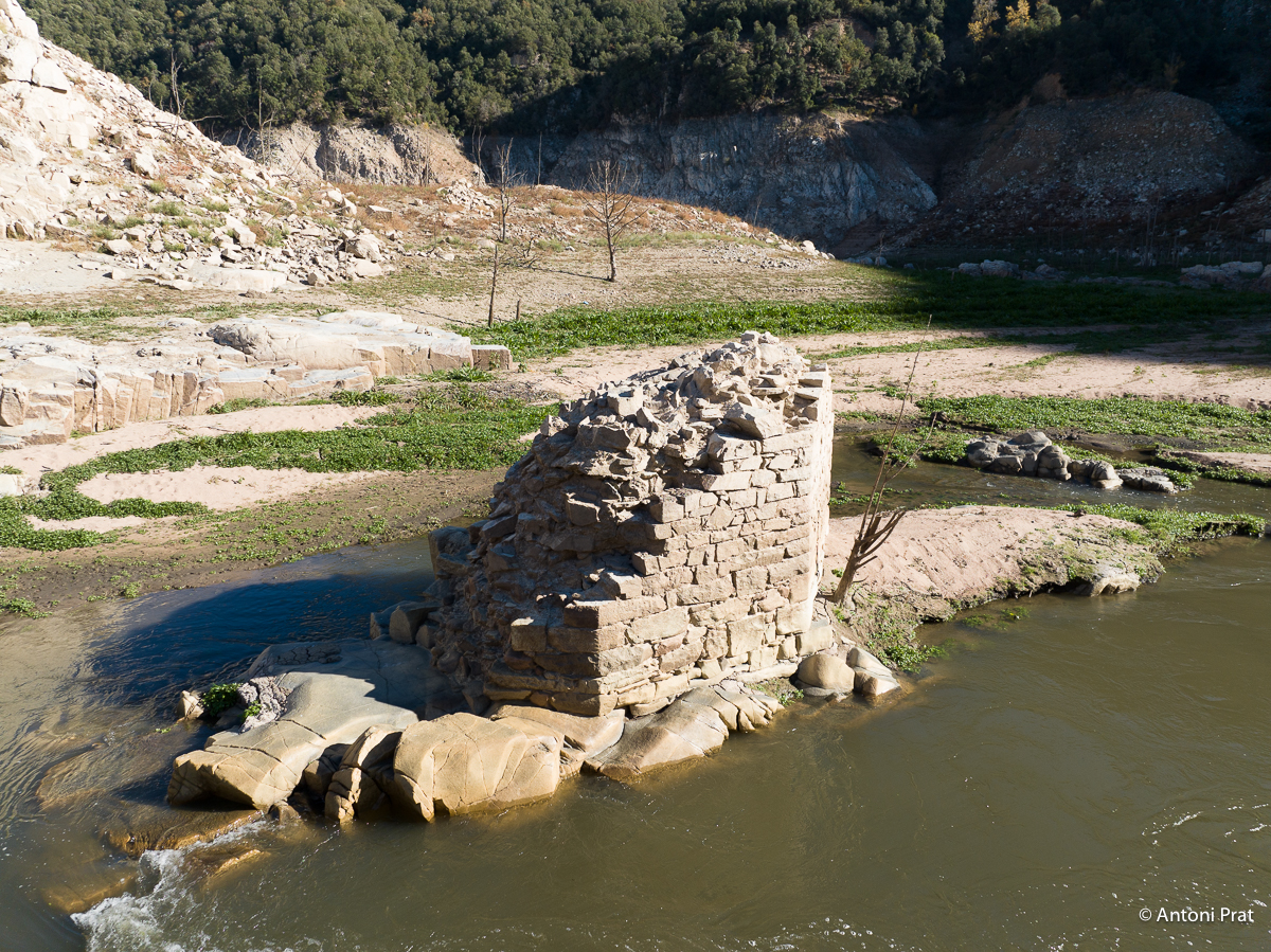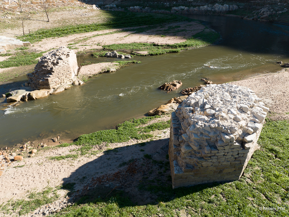 En queda tan sols la part inferior de les dues pilastres (el pont, per tant, tenia originalment tres ulls), fetes de pedra i morter i amb els forats dels xindris ben visibles. En el moment de la construcció del pantà de Susqueda, que el va negar, el pont ja estava en desús.