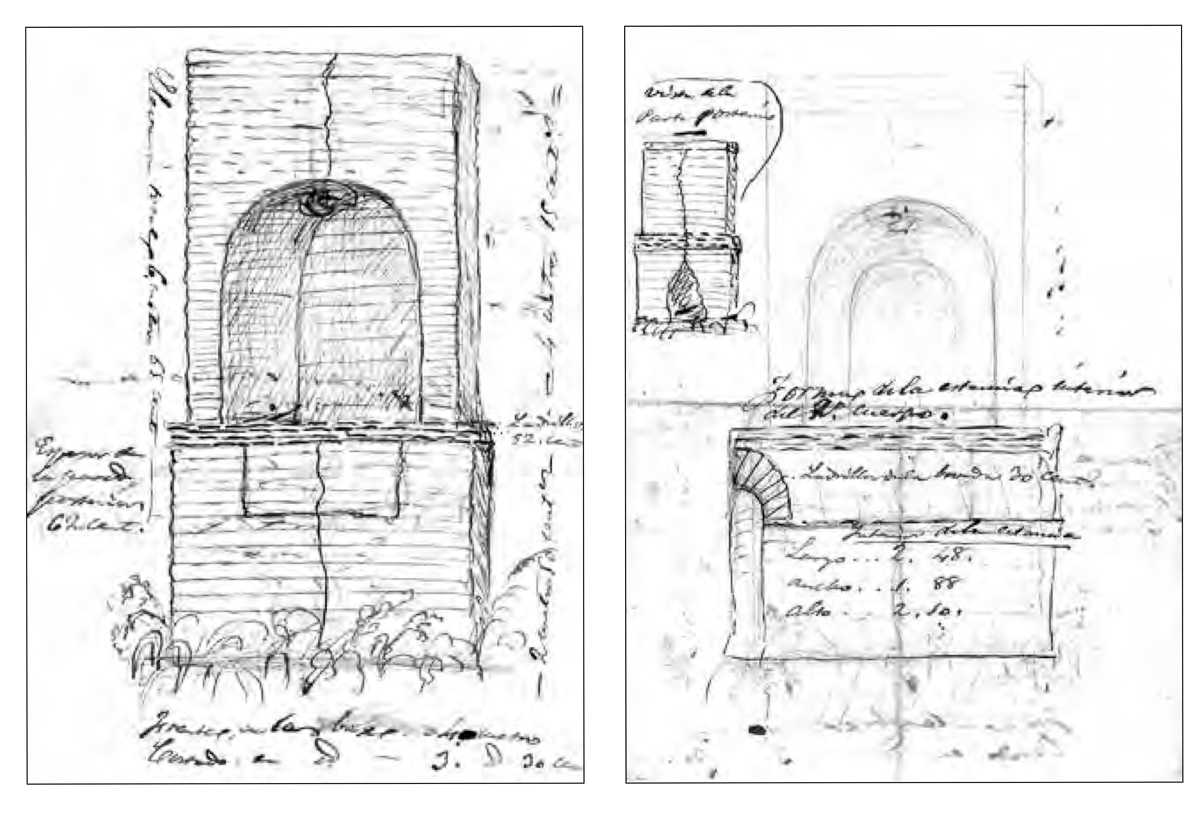Debajo de esta cornisa, esto es, en el primer cuerpo, hay una cavidad que señala claramente el lugar donde hubo una lápida.