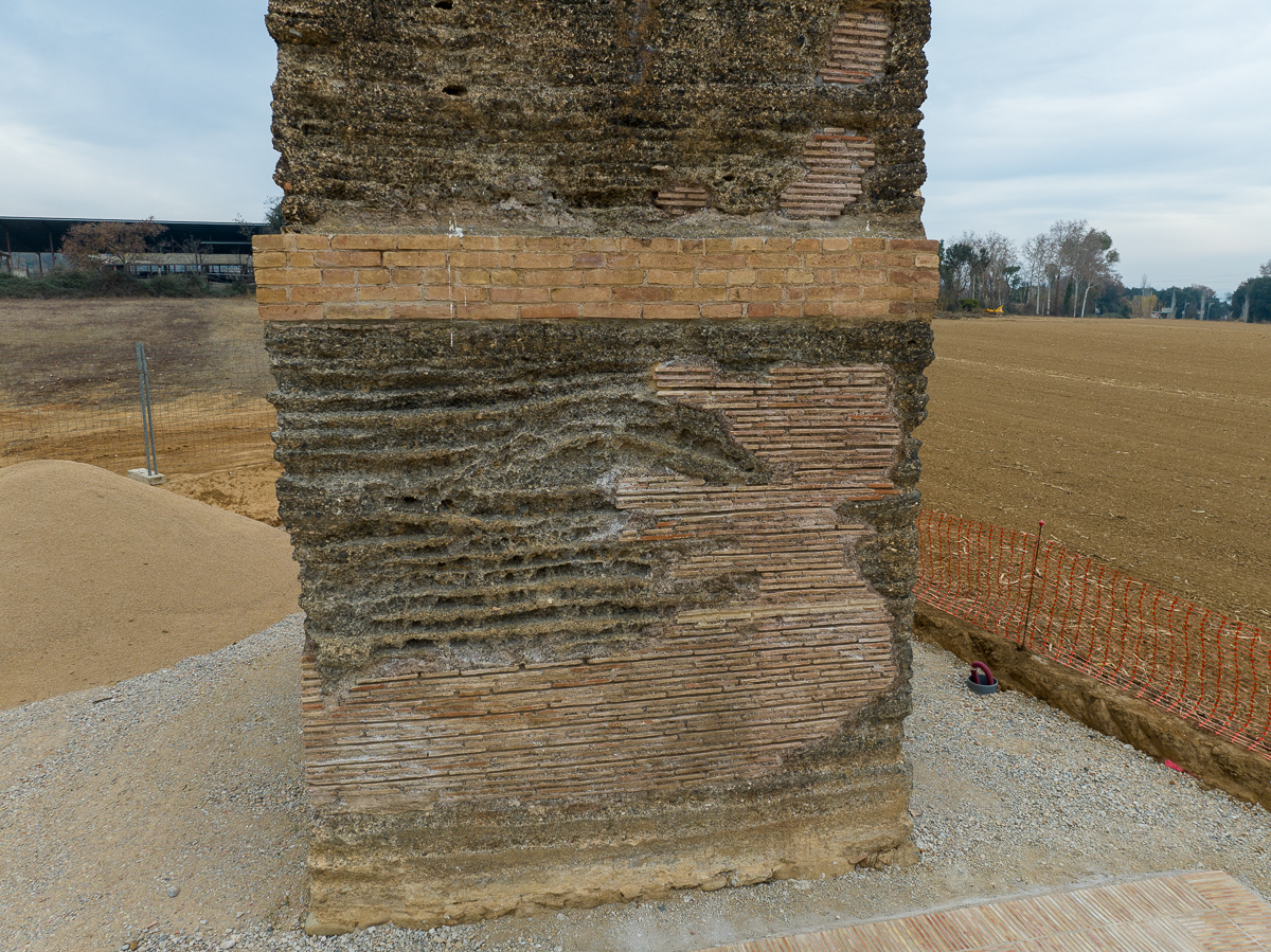 Su construcción es de hormigón compuesto de cal y de pequeños pedazos de piedra volcanizada, lo cual le da un aspecto muy oscuro, de modo que parece hecha de escorias de hierro. Está construida por bandas o capas superpuestas al modo que las paredes de tapial. El hormigón ha tomado mucha consistencia, y hay parajes en que casi es tan duro como la piedra. La banda de ladrillos de 52 centímetros de longitud que divide los dos cuerpos del edificio constituía una cornisa que a la sazón está muy mutilada.